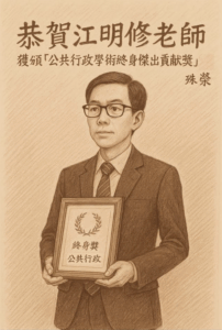 在行政學術領域孜孜耕耘近四十載的政治大學名譽教授江明修,今年四月底獲得「公共行政學術終身傑出貢獻獎」。這個獎項頒發給在公共行政學術領域長期耕耘、研究成果豐碩且對學術發展有卓越貢獻的學者,旨在肯定獲獎者在公共行政理論建構、研究方法創新、人才培育以及對台灣公共行政學術社群的影響力。